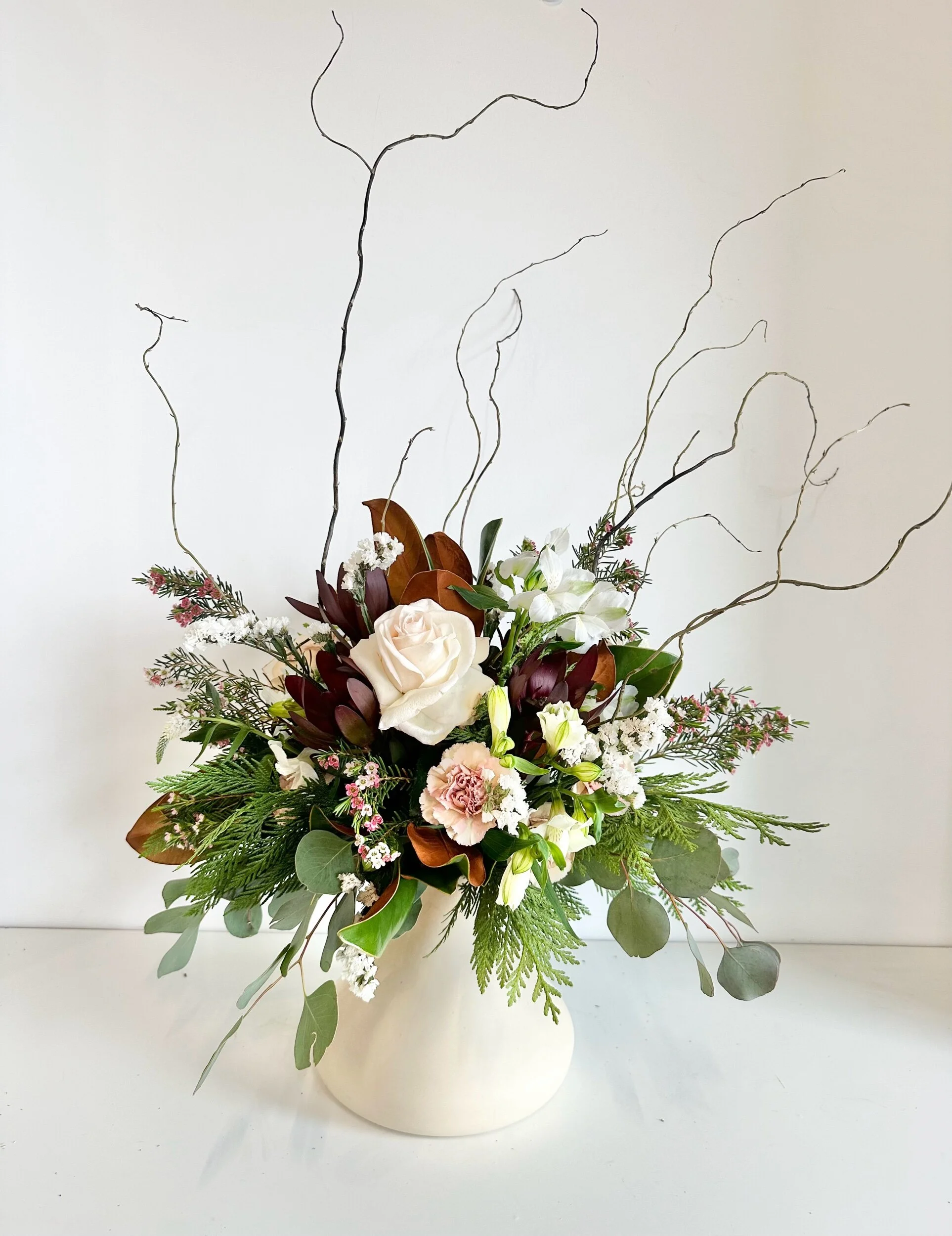 Designed in a modern red vase, this festive floral arrangement brings a touch of holiday warmth to any space. Created with fresh seasonal blooms, fragrant evergreens, and textural accents, each piece captures the beauty and spirit of the season in Bloom Culture’s signature natural style.